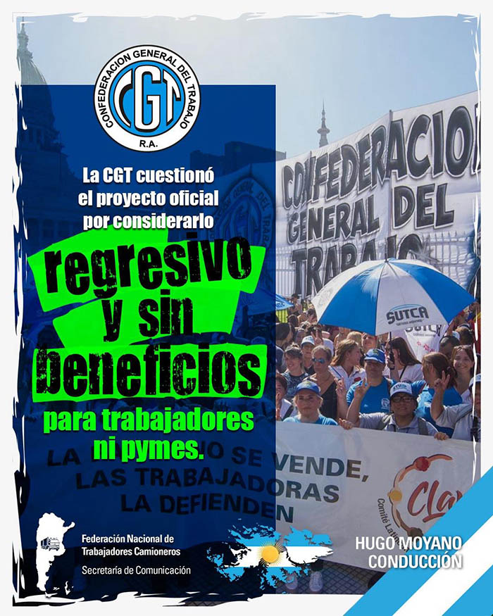 La CGT cuestionó el proyecto oficial La CGT cuestionó el proyecto oficial por considerarlo regresivo y sin beneficios para trabajadores ni pymes.