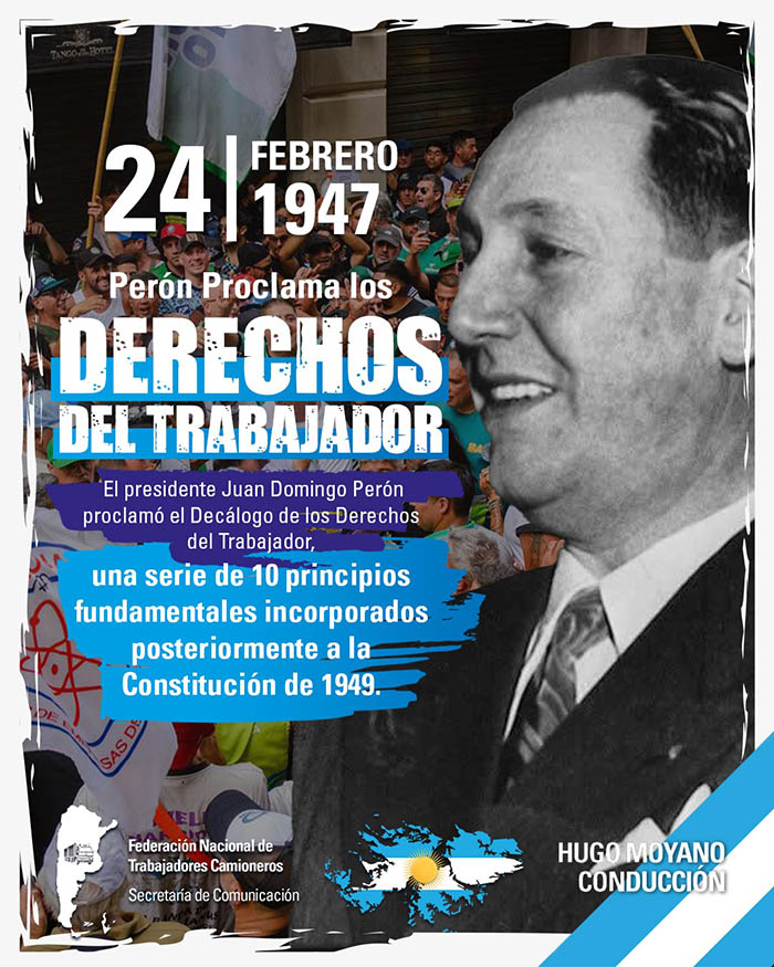 El presidente Juan Domingo Perón proclamó el Decálogo de los Derechos del Trabajador, una serie de 10 principios fundamentales incorporados posteriormente a la Constitución de 1949.